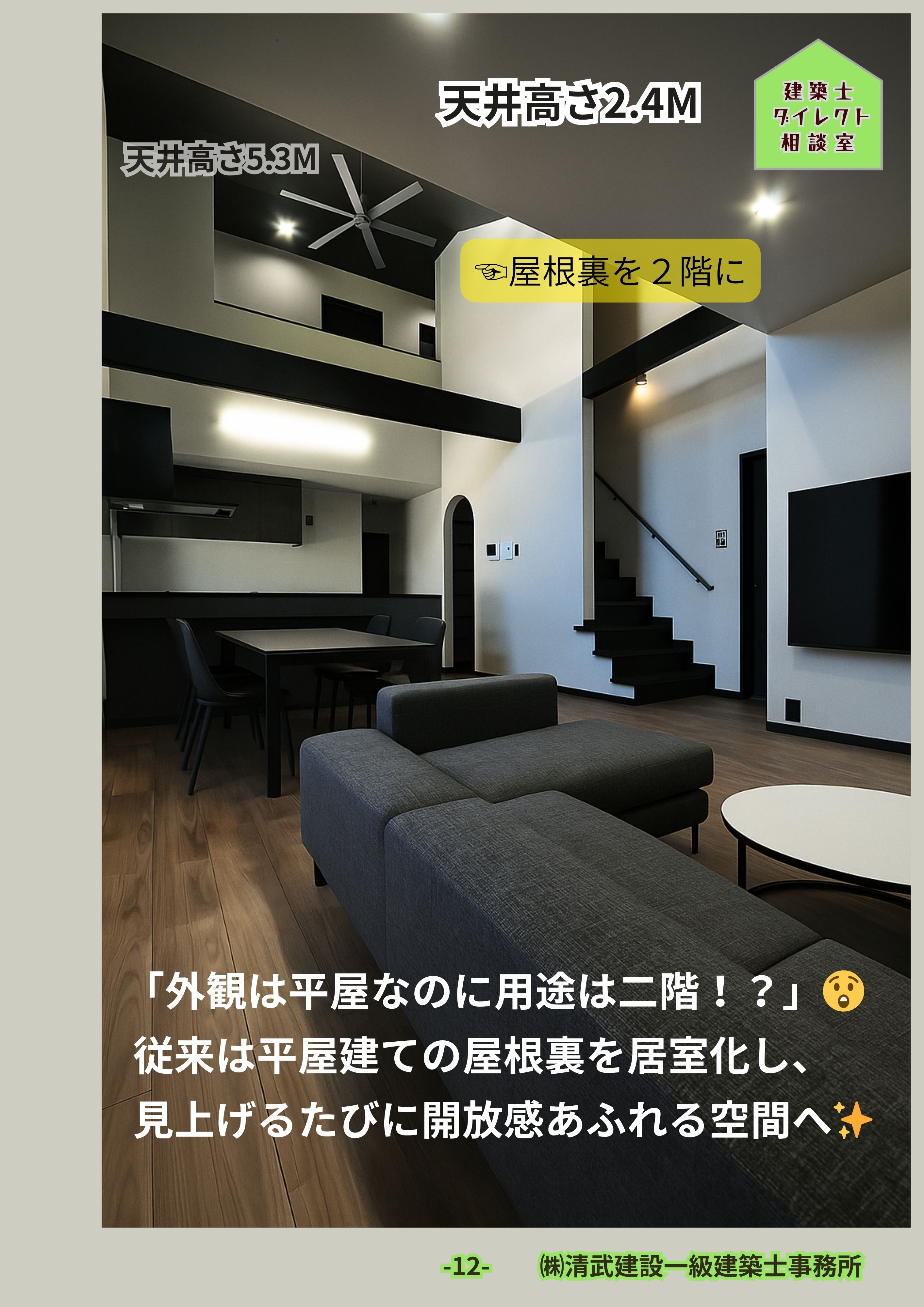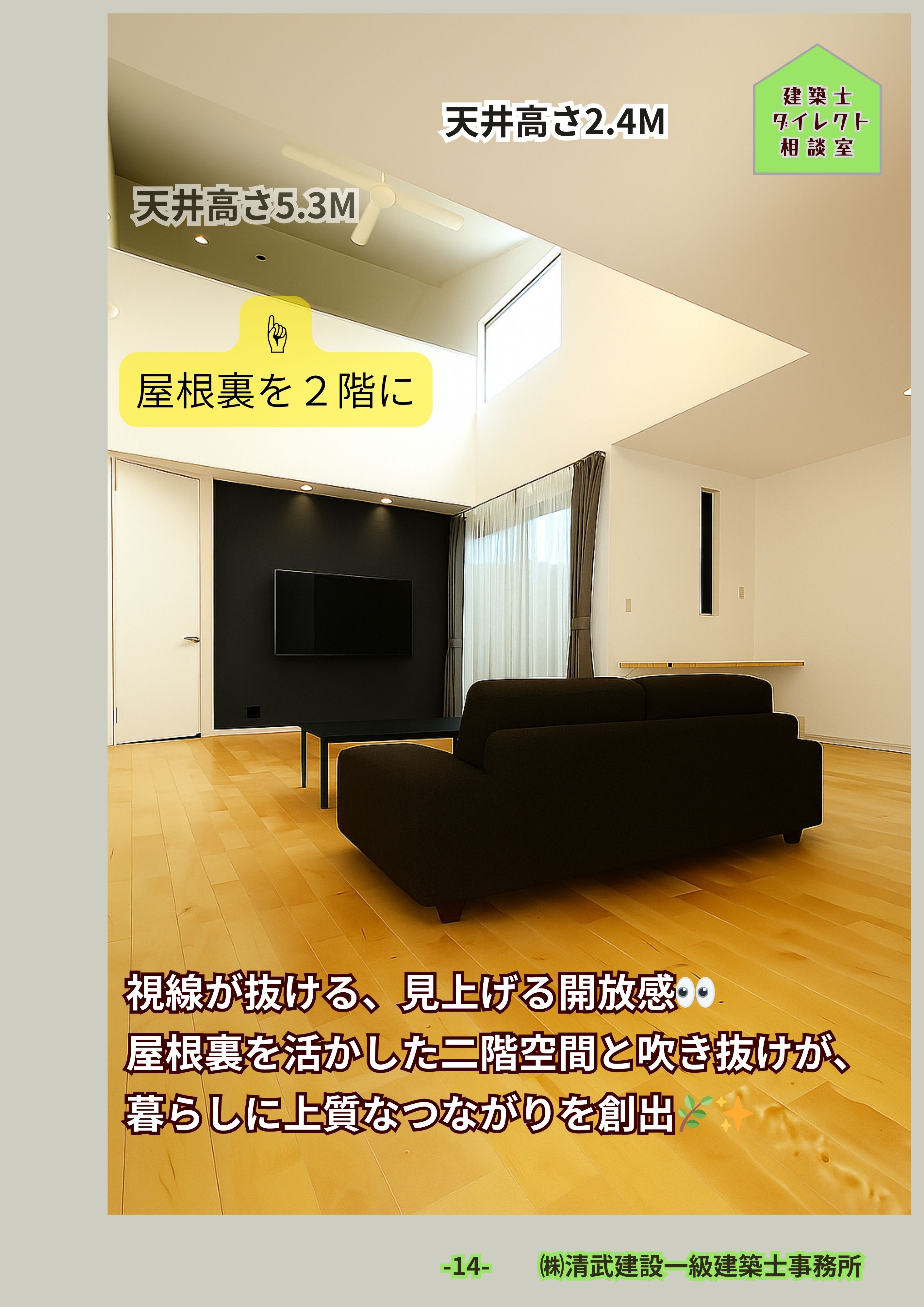 屋根裏利用の収納や趣味の部屋、子ども部屋などに活用可能。 - デザイン性と開放感